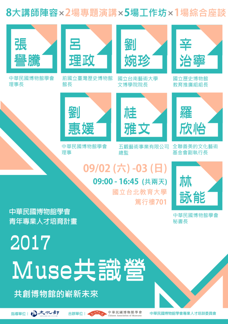 2017 Muse共識營講師簡報下載 On 九月 8, 2017 【專題演講】博物館重要的事:談博物館的意義與價值 中華民國博物館學會理事長 張譽騰 >>>下載 【工作坊】博物館人的未來 五觀藝術事業有限公司總監 桂雅文 >>>下載 Share