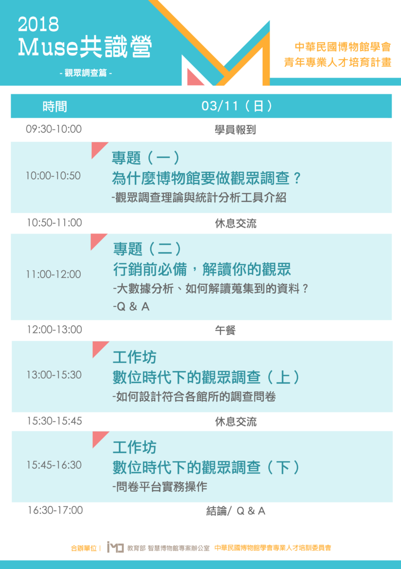 感謝各位熱烈地報名,本次由中華民國博物館學會、教育部智慧博物館專辦主辦的「2018Muse共識營-觀眾調查篇-」活動之正取學員條列如下。期待與各位當天活動現場見喔!