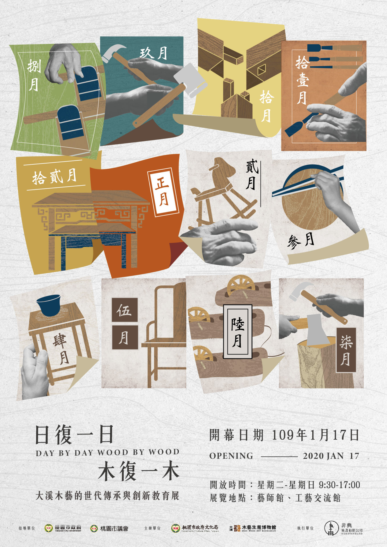 大溪木藝的發軔、傳承、創新,來自於木職人「日復一日」地磨練自己的技藝,「木復一木」守護著傳統工藝,同時也守護著家業與文化的延續。「日復一日、木復一木」特展,希望邀請觀眾一起走進木藝職人的承傳日常,並且看見在循環往復之間,萌發的創新與教育之芽,在大溪木藝生態博物館與學校的合作之下,如何進入校園,變成活潑有趣的木知識,讓木藝持續在大溪,日復一日地綿延下去。本展覽分別於二個展館展出,「藝師館」介紹大溪四組木藝師的傳承故事,展現大溪木藝傳承百年的精神;「工藝交流館」大溪木藝教育扎根成果,以木育互動裝置引導觀眾認識木育。