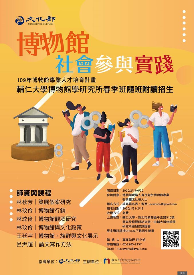 由文化部補助本所辦理「2020年博物館專業人才培訓計畫」,本年度的主軸為「博物館社會參與實踐」,為擴大人才培訓效益,提升國內博物館從業人員之專業知能,特別開放輔大博物館所春季班課程,提供隨班附讀進修機會。