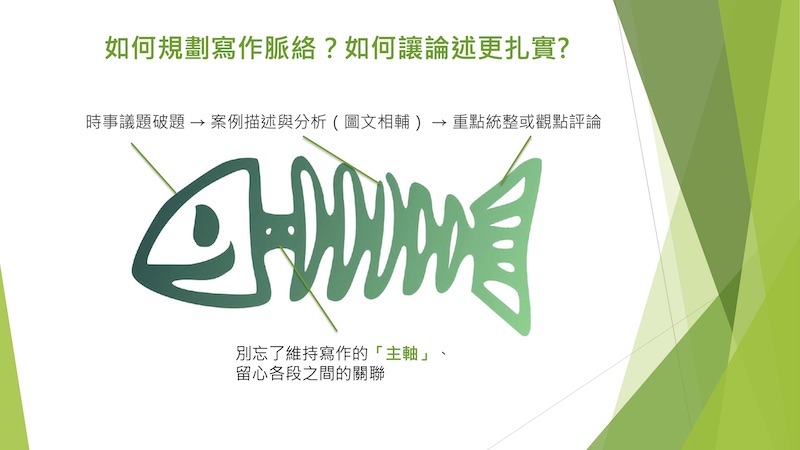 網路文章如何在短時間內抓住讀者目光,是線上書寫的成功關鍵。博物之島執行編輯田偲妤建議可從文章架構下手,參考魚的骨頭排列。開頭如同魚醒目的大頭,可用問題意識破題,誘發讀者往下閱讀的好奇心。中間段落如同魚的身體細刺,以具體詳實的案例描述,搭配吸睛的圖片。最後如同魚有力的尾巴,以重點統整或觀點評論作結。