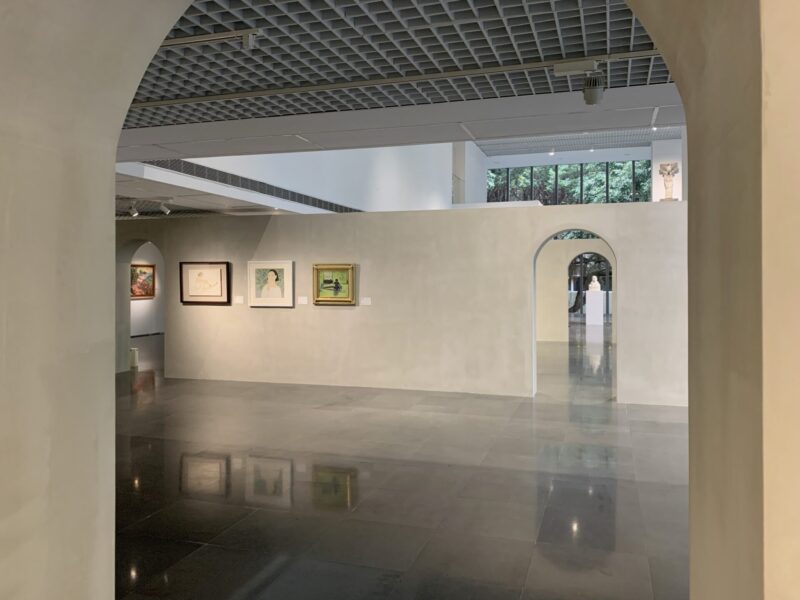 從展覽精神延伸,北師美如何運用「向城市開放的空間」與穿透力特色[註4]為觀眾創造再發現的場域?踏入二樓展場,觀眾先為挑高空間中層層拱門所吸引,再定睛至正中央的黃土水〈少女〉胸像。《不朽的青春》以拱門貫穿展場設計,館員王若璇表示,拱門為歐洲早期教堂與臺灣傳統建築經常運用之元素,藉由拱門的建築語彙,企圖打造具有年代感的展場環境,當觀眾走過三道拱門,一步步接近〈少女〉,便猶如一場穿越時空、與1920年代藝術家開啟對話的儀式。而展牆特別使用「樂土」,透過層層疊刷的環保媒材,形塑宛如清水混凝土的顏色與質地,塑造現代氛圍,使展場構成古典及現代情境的平衡。