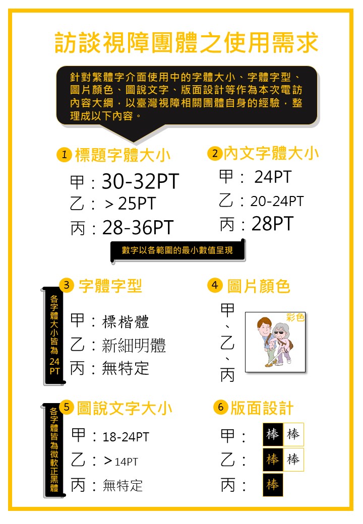 然而,在參考國外大字簡介範本後發現,國外大字簡介並無法完全套用至中文繁體使用介面,因為中文繁體與英文的字體大小、字型、字距、行距、中英文筆劃皆不同。為了更了解臺灣低視能者的使用需求,小組更進一步訪談臺灣視障團體的閱讀需求,透過電話訪談三個視障機構的工作人員(分別以甲、乙、丙代稱),重新審視大字簡介的設計概念,從下圖可概略了解低視能者在閱讀文字時的需求。