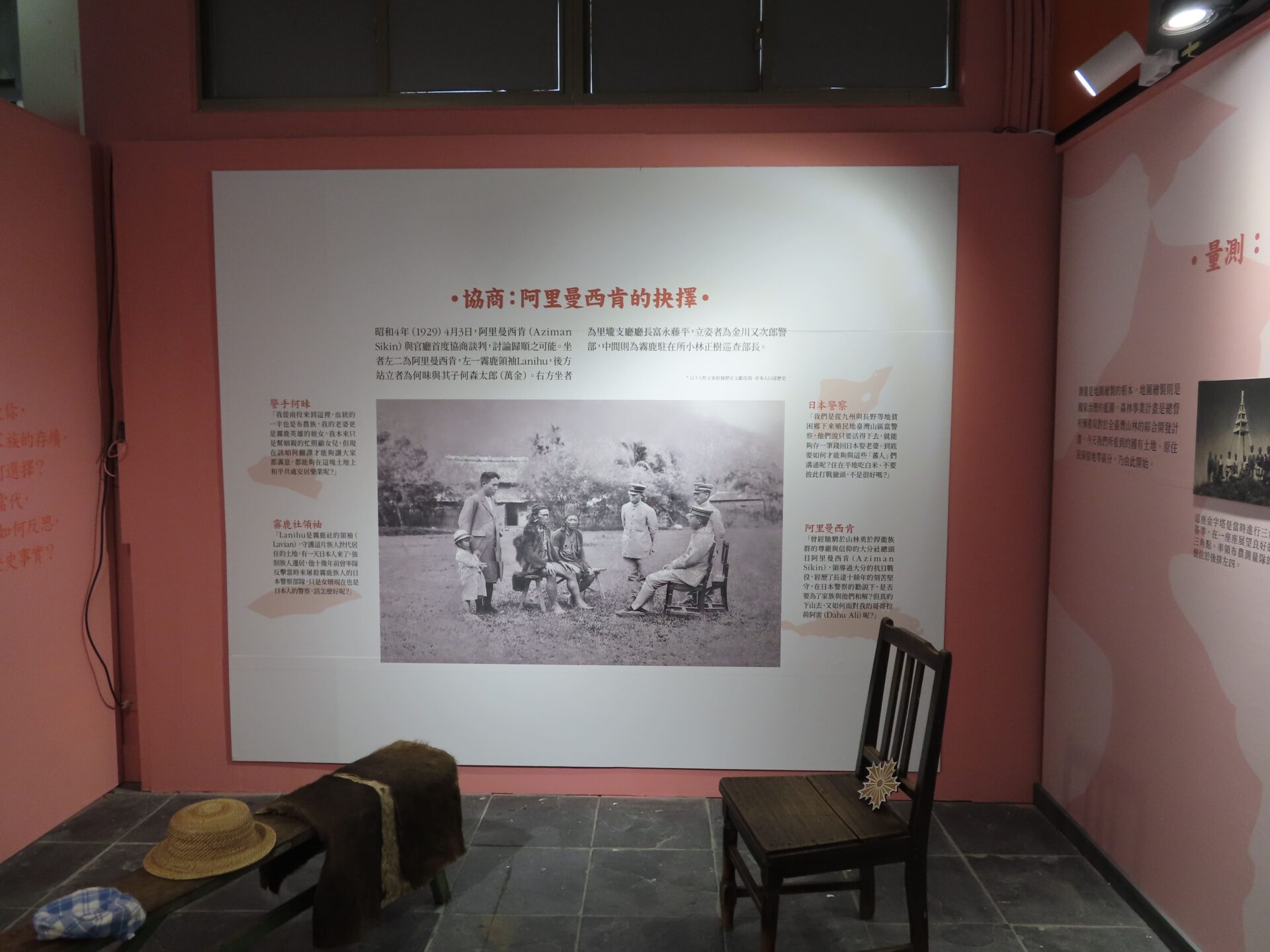 展覽的內容編排與展示設計也值得觀察。「烈日疊影」特展位於海端館三樓特展室,一進入展場,迎面而來的是一大幅由日本總督府殖產局技師、里壠支廳外勤員警與能說布農語的巡查何昧,於新武呂溪上游調查山林資源時留下的合影,見證當地布農族殖民統治史的開端。這張照片以大型燈箱呈現,成為展覽的主視覺。不同於過去展場經常使用的右轉動線,大燈箱巧妙地引導觀眾從左側進入,這個小小的動線改變標示著習慣性觀點的位移。