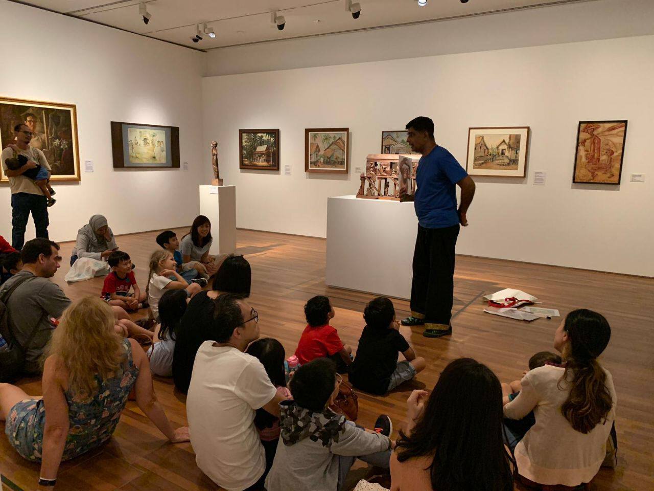 《孩子們的美術館!》(GalleryKids!)系列下的〈藝術中的故事〉(Stories in Art)為目前NGS線上兒童學習資源中,唯一定期於常設展廳舉辦的現場教育活動。每場活動約為45分鐘,目標觀眾為10歲以下孩童,每月選取一至兩幅富含新加坡文化特色的典藏畫作為主軸(如:新加坡早年地景、馬來舞蹈、東南亞生活樣貌等),與在地專業說故事團隊合作開發活動,引導孩子觀察作品畫面,串連說唱肢體律動,最後連結童話故事,創造適合小小孩的美術館體驗。