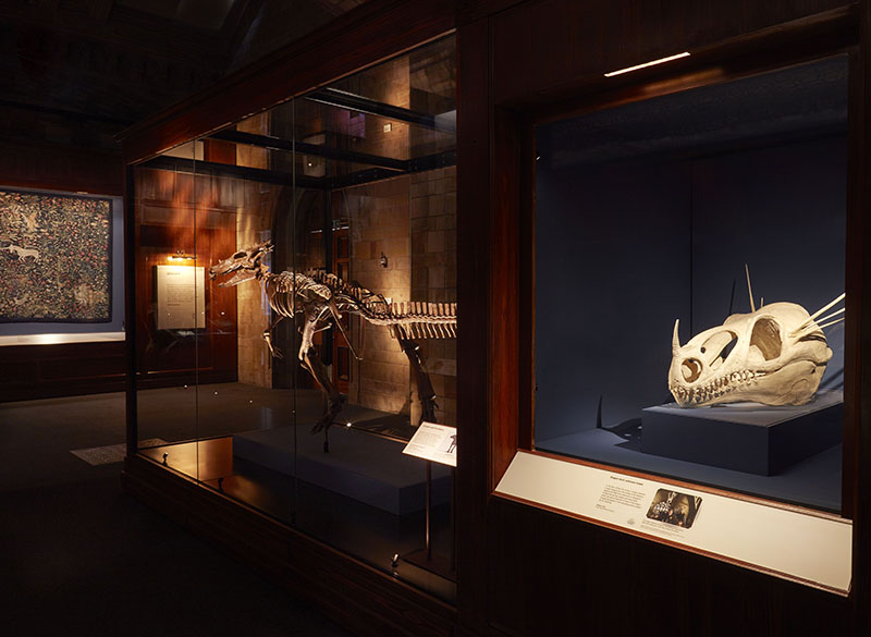 在現代科學萌芽前,人們深信各種神奇動物的存在。美人魚、獨角獸、海怪……牠們從未問世,卻一直存在於人類的想像之中,代代相傳。展覽並不試圖抹除神話野史的歷史地位,反而將之與考古科學並置,試圖從好奇心建構的傳說故事中,爬梳自然史的發展。歐洲人自中世紀便相信獨角獸是真實存在的動物,認為這優雅的生物帶有神奇的力量,特別是頭頂的尖角具有療效。在展覽中,一張源自中世紀的裝飾掛毯和出版於1650年的百科全書合併展示,前者描繪獨角獸在茂密森林中一枝獨秀,後者鉅細靡遺地分析各種獨角獸的特性,呈現歐洲人對獨角獸的崇拜。