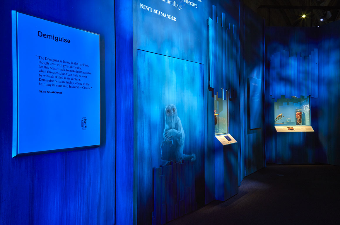 進入展場,《怪獸與牠們的產地》主角紐特(Newt Scamander)率先登場,他所身著的紳士套裝和攜帶的魔法皮箱為展覽揭開序幕。這名魔法動物學家自小就鍾情巫師世界中奇異多樣的生物,他遊歷世界以發掘、採集、研究並保育這些奇獸。如此以虛構角色引領觀眾觀展的做法頗具趣味性,不論是否為書迷或影迷,皆能跟隨故事線而融入其中,在真假虛實交織的旅程中探索。