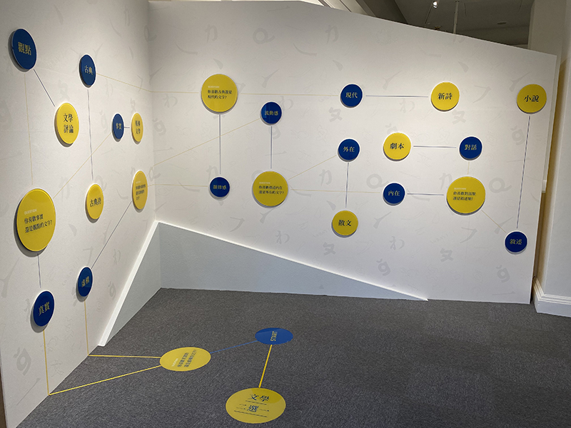 展區的最後,設計了「文學二選一」體驗區,透過提問,讓觀者理解不同文類的區別:「你喜歡真實的,還是虛構的文字?」、「你喜歡事實,還是觀點的文字?」、「你喜歡有韻律感,還是流動感的文字?」⋯⋯扣合至展覽開頭所提出的討論,回歸「文字」本身,文字質地的感受性,以及符號背後埋藏的內在規律、形式及內容,即為文學本身,像是做心理測驗,隨著自身的喜好前進,遊走展場的迷宮遊戲,線路的盡頭終會有解答。