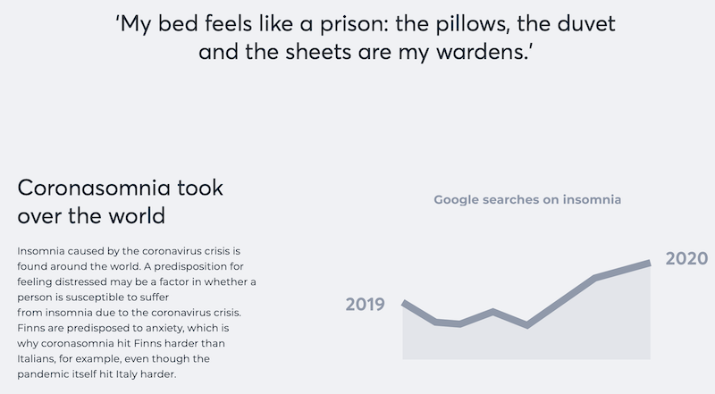 線上博物館也以保羅・艾克曼(Paul Ekman)情緒理論中的六種基本情緒規劃主題,探索疫情期間人們的行為如何影響身心健康。你感到憤怒、驚訝、厭惡、快樂、恐懼還是悲傷?博物館透過搜尋引擎、流行消費趨式、社交媒體和網路現象等追蹤各種情緒反應。以「失眠」為例,此字的Google搜尋率自2020年開始戲劇化飆升,顯示失眠症狀在疫情爆發後成為普遍問題。觀眾還可從一段段影片了解各領域專家對每種情緒的影響分析,包括情緒對身心修復的影響、因疫情而導致的焦慮和失眠問題,以及夫妻與家庭所面臨的挑戰等。