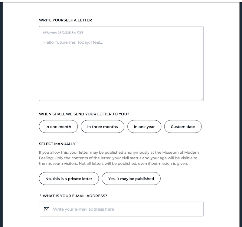 自新冠疫情爆發以來,因應疫情所採取的隔離政策,導致人們長期處於社交孤立的狀態,而各種關乎健康、經濟、家庭的壓力隨之排山倒海而來。為了幫助民眾省思疫情期間引發的情緒問題、維護身心健康,芬蘭政府於2021年10月創建了「當代情緒線上博物館」(Museum of Contemporary Emotions),結合科學與藝術,記錄芬蘭大眾於疫情期間的身心現象。