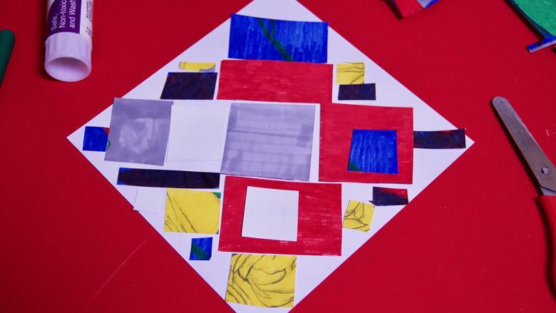 以本期展覽「蒙德里安藝術展」為例,荷蘭畫家皮特・蒙德里安(Piet Mondrian, 1872-1944),為知名風格派運動藝術家、抽象繪畫的創始者之一,最著名的作品為由「簡單的幾何形狀」呈現之抽象畫。蒙德里安的靈感來自他周圍所見的世界,慣用水平和垂直線條表現的格子,以及色彩基本原色(紅色、黃色、藍色)以及黑色、白色和灰色創作。DIY活動教孩子自製「頭頂取景器」,嘗試使用三原色創作圖畫,感受蒙德里安繪製風景時所見之形狀,體驗觀察世界的全新方式。透過這個活動,家長可以帶著孩子從不同角度仔細觀察指定物件或熟悉的風景,並使用幾何形狀和強烈色彩創造屬於自己的蒙德里安風格作品。