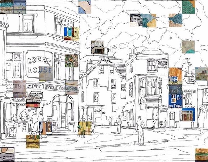 數位拼布被是一項集體創作計畫,博物館廣邀192位參與者共同再創作—藝術家Edward Leslie Badham於1905年移居黑斯廷斯的畫作「三角窗店面和藍沙龍」(Corner House and the Blue Saloon)。藝術家以油畫、水彩等媒材與技法描繪當時舊城區的街道情景,其中凸顯的社區風貌與生活感在疫情中顯得彌足珍貴,也是挑選這幅畫作的原因之一。