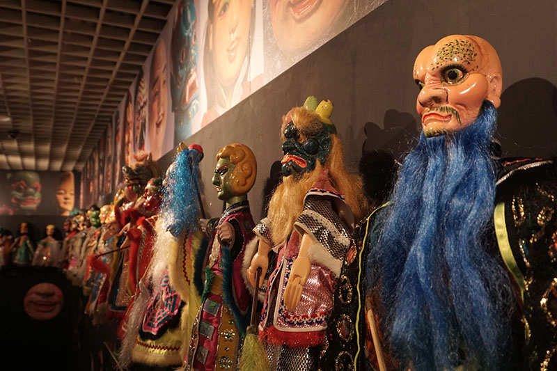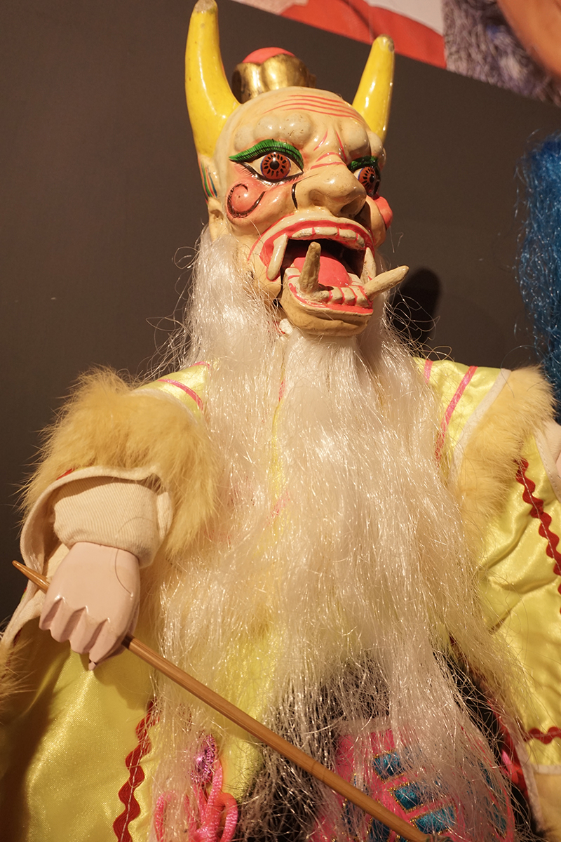 五月初於台北偶戲館登場的《神將鬼斧造容顏》特展(2021/5/1-2022/2/13),館方用了十足的展示和研究力道,展出了台灣布袋戲發展史中,時常被大眾所忽略的「金光戲」。金光戲偶臉譜巨大,面貌畸形怪狀,身著五光十色的道袍,一整列掛在牆上看來氣勢非凡;底下,陳列著戲偶們成排荒誕十足的「金光姓名學」:「千年釋迦道行深高俠」、「蜈蚣王 萬毒君」、「天仙姑醉美人」、「天船秘者吞劍王」怪奇又詭譎,令人不經詫異,金光戲到底從何而來?為何它與刻板印象中的「布袋戲」呈現出如此截然不同的面目?