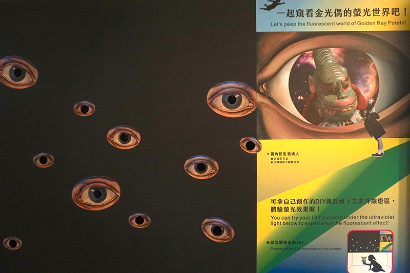台北偶戲館《神將鬼斧造容顏》特展,觀眾可從展場特別設計的孔洞中,看見「獨腳怪叟 吸魂人」在黑暗中演出的效果。(劉庭妤 攝影)