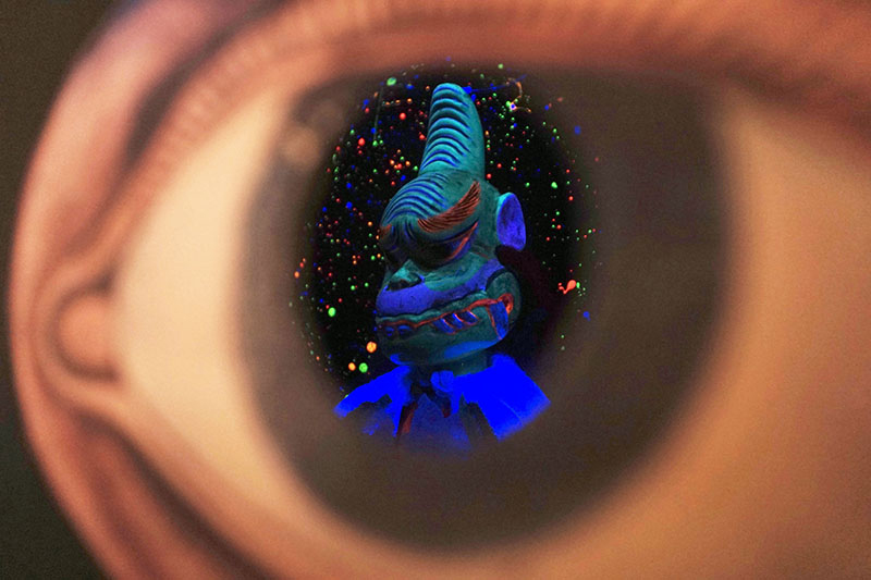 台北偶戲館《神將鬼斧造容顏》特展,觀眾可從展場特別設計的孔洞中,看見「獨腳怪叟 吸魂人」在黑暗中演出的效果。(劉庭妤 攝影)