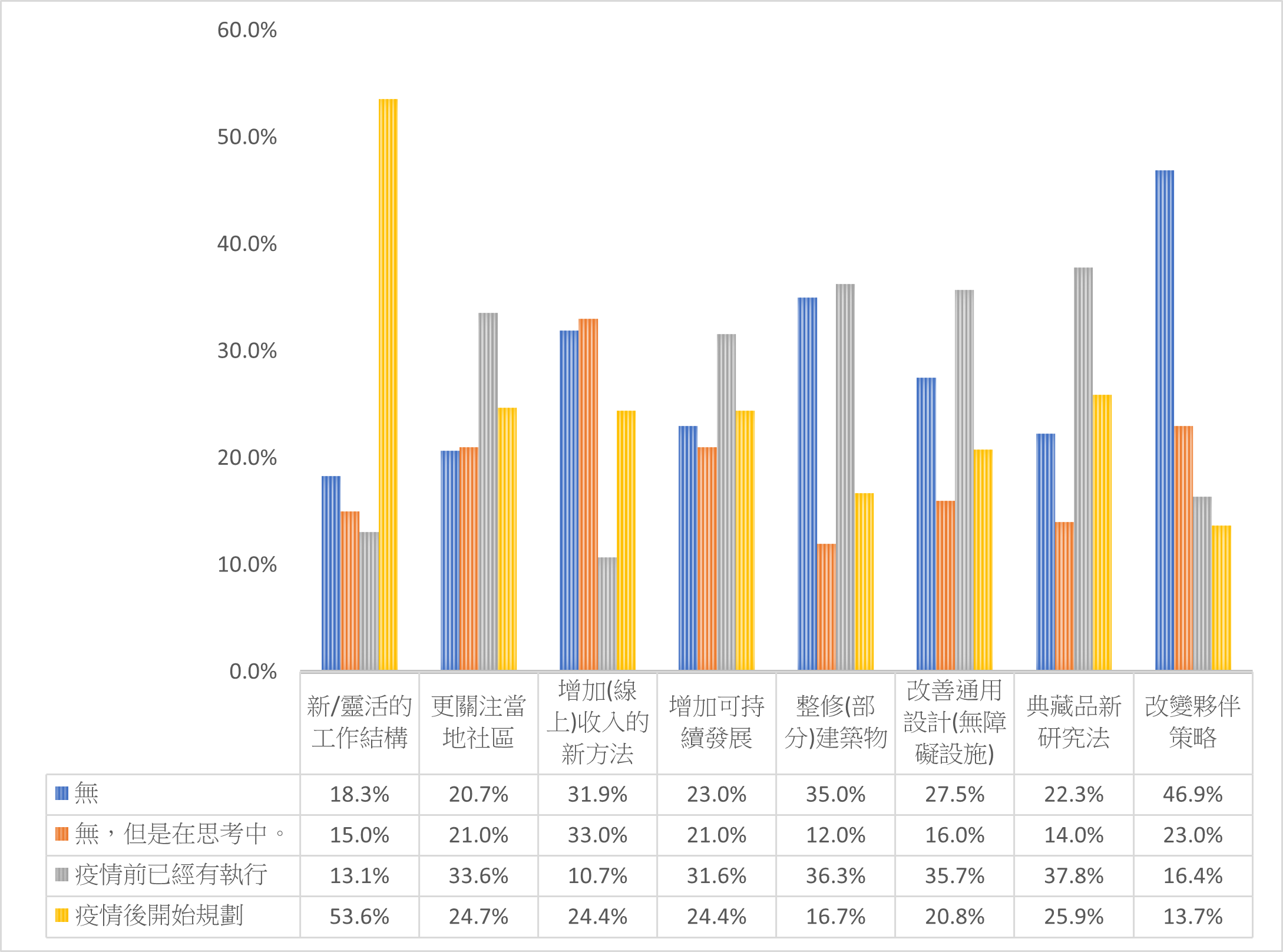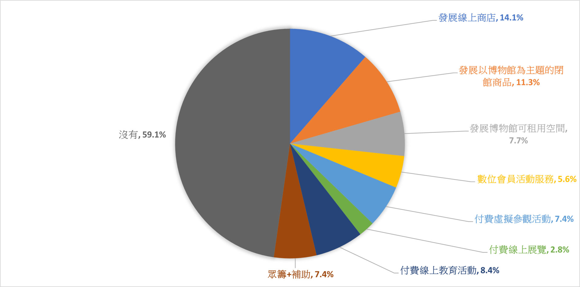2020年的調查顯示,多數博物館因應防疫措施而閉館,導致參觀人數急遽下降或瞬間歸零,估計超過70%博物館的來客數減少50%以上。為了維持館舍營運與員工薪資,博物館嘗試經由不同管道申請補助(緊急援助基金、員工薪資補助為主;圖2),並新增營收方式(發展線上商店、線上付費參觀、虛擬導覽與教育活動等;圖3)。然而,第三次的調查報告顯示,仍有36.1%的博物館沒有得到任何財政支援,超過59.1%的博物館沒有嘗試新的營收方式。博物館在減少收入與財源、業務能量降低之際,公眾獲得文化近用(cultural accessibility)的機會終將受到影響。因此,博物館急需緊急方案調整其商業模式以獲得穩定財源,並讓員工與約聘雇者接受不同的技能培訓,以重新適應新的工作方式,最終目標是達成博物館的可持續性營運,並發揮在社會上的基礎功能。