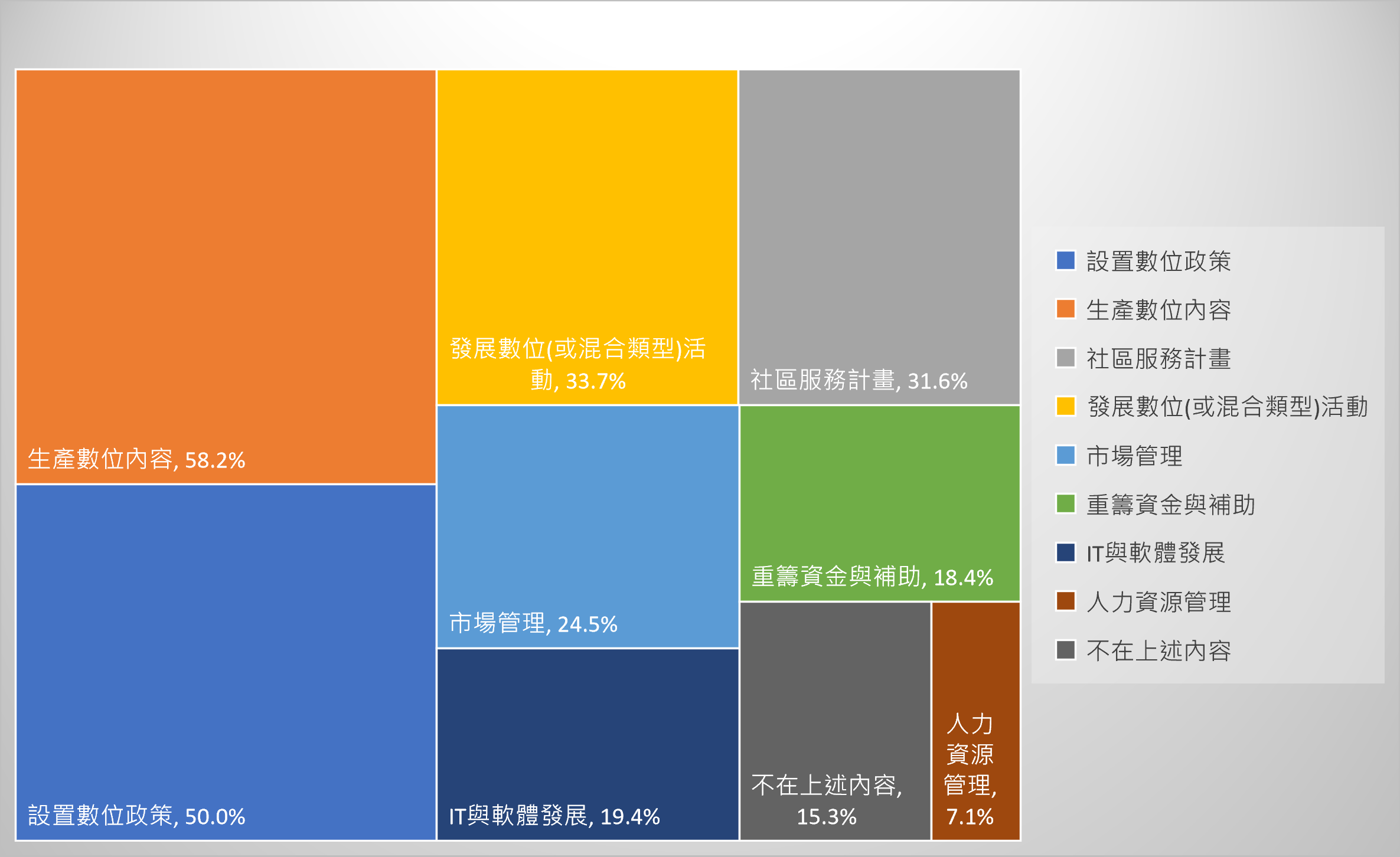 除了數位服務的發展最受關注之外〔註4〕,疫情也讓博物館更了解必要的補足措施。圖4說明機構所採取的新營運策略,圖5則說明機構需要發展的新技能。其中53.6%博物館在疫情後開始規劃「新/更靈活的工作結構」,58.2%認為需培養生產數位內容的技能。雖然對多數博物館來說,大部分營運策略與技能都是疫情發生之前就開始規劃與執行的業務,但疫情的瞬間爆發加劇了問題的嚴重性,特別是在經濟上可持續營運的能力。然而,對於博物館專業人士來說,這也是讓潛在問題浮現的契機,有了化危機為轉機的動力!