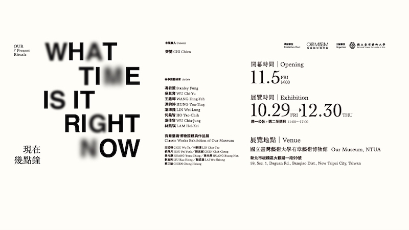 10月至年底是臺灣藝文界的活動高峰,也是許多新銳策展人與藝術家嶄露頭角的時刻。國立臺灣藝術大學有章藝術博物館也沒有缺席,年度藝術盛會「大臺北當代藝術雙年展系列」及平行展「超領域選粹策展」正在熱鬧展出。其中,超領域選粹策展是源自「教育部推廣藝術教育」計畫下的一項公開徵件,提供年輕策展工作者與創作者展出空間與資源,幫助其累積展務實作經驗。今年度由策展人齊簡策劃的《現在幾點鐘—我們的七個「現在」儀式》通過評審決選,於10月29日至12月30日在有章藝術博物館本館展出。