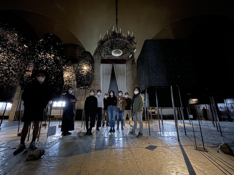 臺灣館《台灣郊遊》普里奇歐尼宮展場,本屆策展人、國美館承辦人、佈展運輸等人員合影,右為《野長城》作品、左為《天然修道院》作品。(國立臺灣美術館 提供/授權)