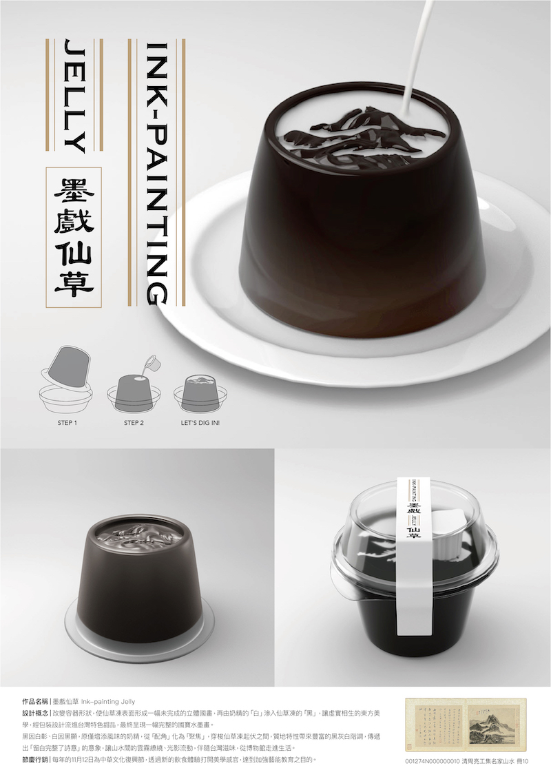 邁入第10屆的《Shopping Design》台灣設計BEST 100,於2020年底以「我們需要的設計」為題,檢視設計之於「我們」的可能性,選出100組台灣值得關注的設計人事物。創作者王蓓恩、劉家欣授權黑丸嫩仙草與國立故宮博物院(以下簡稱故宮)三方合作上市的「墨戲仙草」台味甜品,於New Power Discovering類別以「驚喜設計」備受肯定,可見年輕世代重新詮釋故宮清代山水畫作,將博物館帶進人們的日常生活,展現跨域思維的設計張力,以及該創作豐沛的設計能量。