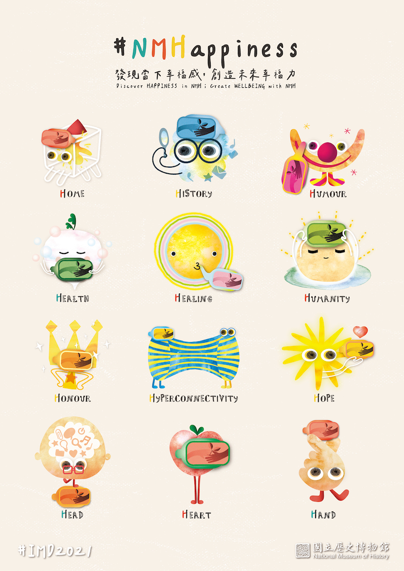 去年至今因為疫情,許多人失去了「平常」,只能在異常之中努力找尋安定,博物館也在這股浪潮中思考如何回應人們需求。2021年,國立歷史博館於國際博物館日推出【#NMHappiness發現當下幸福感,創造未來幸福力】活動,H開頭的身、心、靈幸福精靈,與大家一起「從過去到未來」思考並獲得創造幸福的能力。第一波線上活動,史博館以社群媒體為平台,收集大家對當代幸福的定義與想像。第二波線下活動,則與不同領域、保有童心的大人合作,培育孩子創造幸福的素養,享受當下的幸福經驗、期待未來的幸福共創。