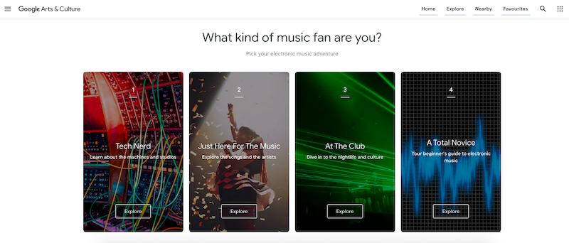 「你是什麼樣的樂迷?」這項提問是展覽主頁面所拋出的首要問題,觀眾可自由選擇欲探索的主題,進入接下來的旅程,包括詳述機器和理論的「技術狂人」、介紹音樂家和歌曲的「為音樂而來」、關注夜店音樂文化的「置身夜店」和簡介電子音樂的「全然新手」。這項展覽所囊括的文獻資料鉅細靡遺地介紹電子音樂發展進程的重要脈絡,同時更透過AR擴增實境展出歷史上經典的合成器(Synthesizer),邀請觀眾在虛擬空間上自由操作與遊戲。
