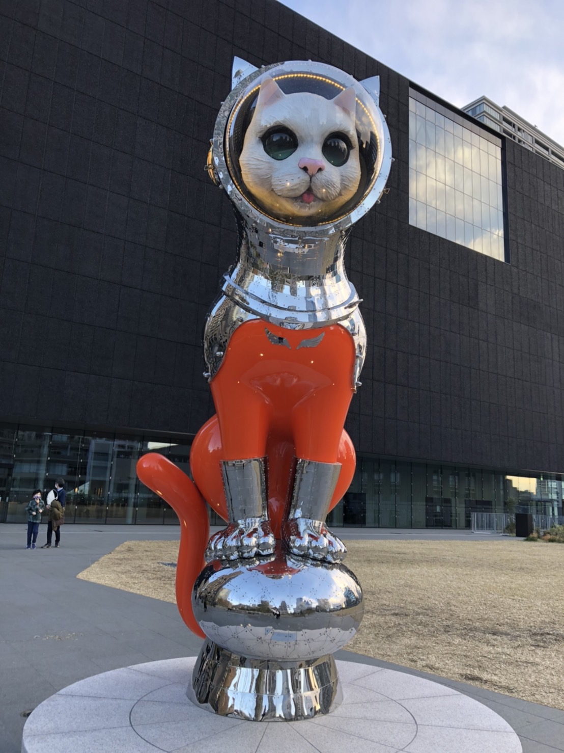 館前廣場上一尊穿著朱色太空衣、揹著氧氣筒、胸前有翅膀印記,象徵著守護21世紀新美術館立足大阪、飛向世界的貓形雕塑作品《SHIP’S CAT (Muse)》(Kenji Yanobe於2021年創作 ),其與美術館建築間的色彩反差及奇特的造型,不只吸引路人的眼光,在社群媒體上也引起話題。事實上,在中之島美術館要起飛前,曾經歷過構想40年、籌備30年的潛龍期。這,是段怎樣的沉潛熬煉呢?又,煉出什麼樣的新美術館呢?