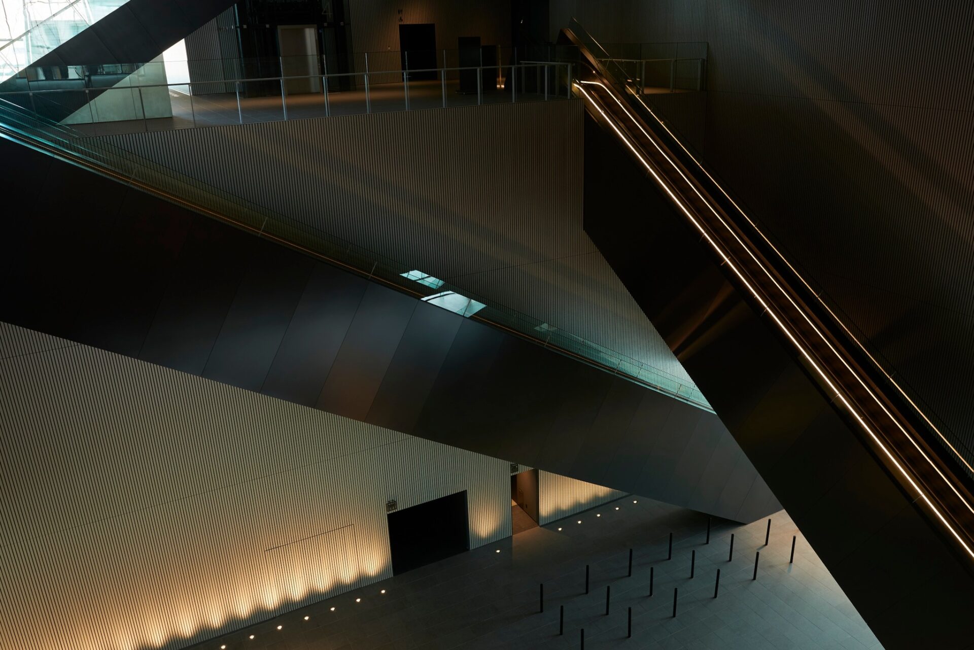 遊步空間在各樓層以不同方向交錯、有時堆累出展示室前的穿堂;有時盡頭就是可眺望街景的黑立方透明開口。在美術館裡隨意遊步或剛看了莫里斯・路易斯的「Omicron」後,彎個角,大阪就在眼前。或抽象,或真實,給觀眾提供了嶄新的視野轉換及都市新體驗。