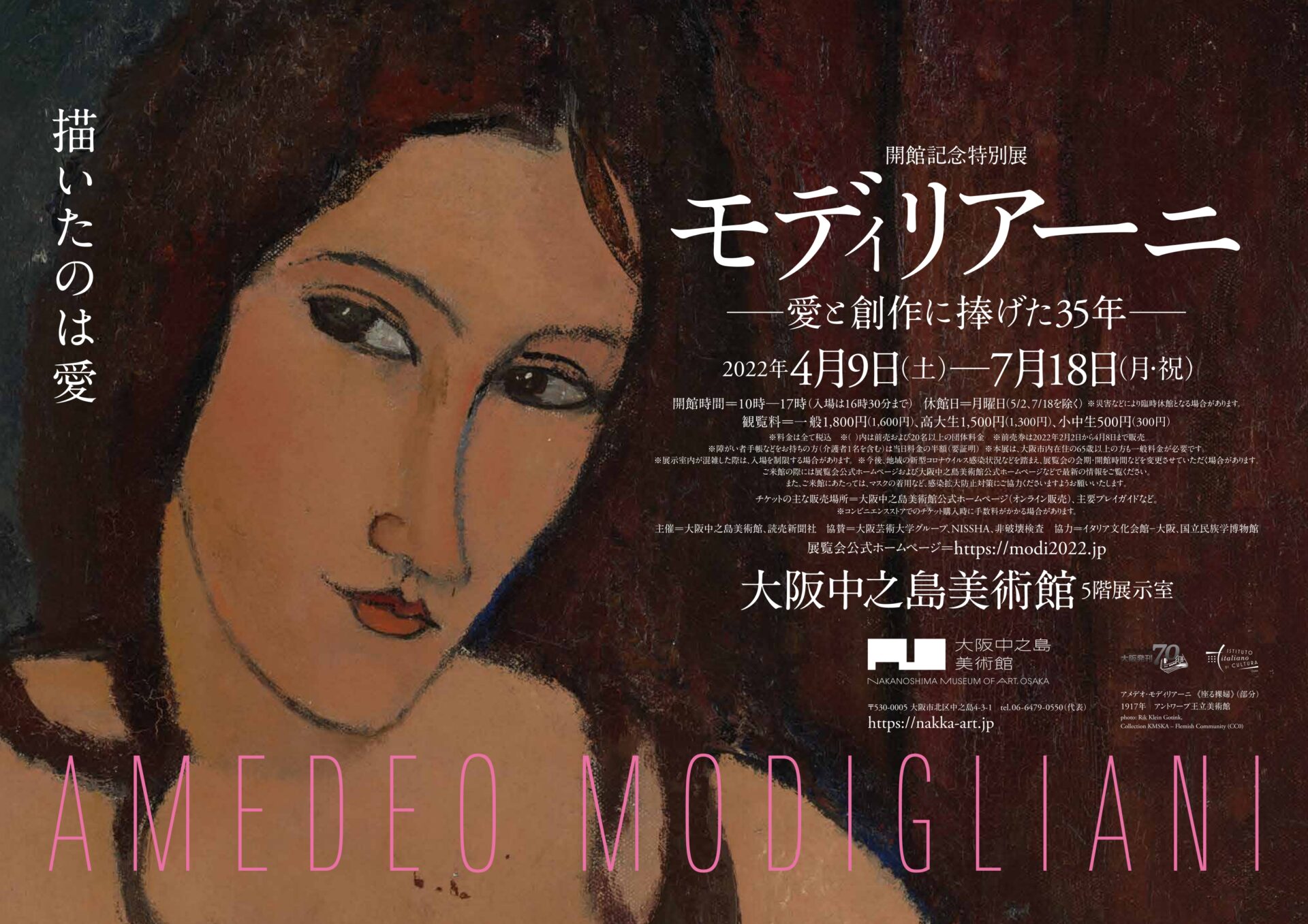 開館紀念展第二棒是「大家的城市 大阪的肖像」(2022.04.09 – 2022.10.02),展覽分一、二期展出。第一期以中之島為起點,呈現從明治維新發展至大正時期日本人口第一的「大大阪」圖像;第二期則述說戰後復興、1970年日本大阪萬國博覽會,至正在準備2025年大阪萬國博覽會的現在。跨世紀且多面向的大阪,經歷高度經濟成長期、生活方式轉變的痕跡,可從約300件的作品及資料一窺究竟。另一方便,館方與讀賣新聞社、日本國立民族學博物館聯手推出開館紀念特展「莫迪利亞尼―獻給愛與創作的35年―」,在業界〔註4〕、館際合作下,集結日本國內外莫迪利亞尼40件作品豪華展出,讓中之島美術館續熱吸晴。