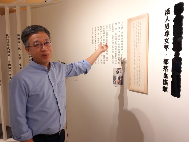 蘇碩斌館長介紹《可讀・性—臺灣性別文學變裝特展》,展覽呈現多本作品的「摘句」,臺文館將其視為展品的一部分,反映文學與社會相互牽動的緊密關係。(田偲妤 攝影)