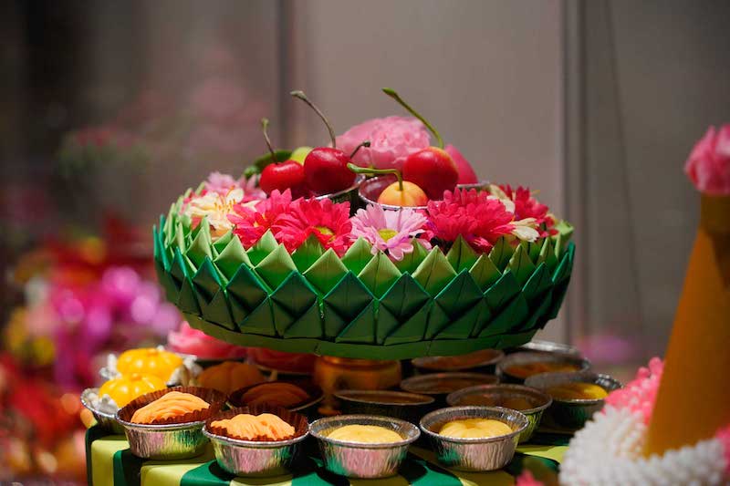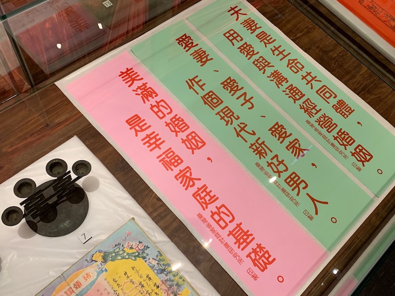 「臺灣省家庭計畫研究所」宣傳標語,則彰顯家庭價值和生活方式的轉變。科博館新住民志工張郁馨更以黏土巧手捏製栩栩如生的模型,分享東南亞婚禮風俗,例如泰國聘禮需要準備各式糕點,表示心意。