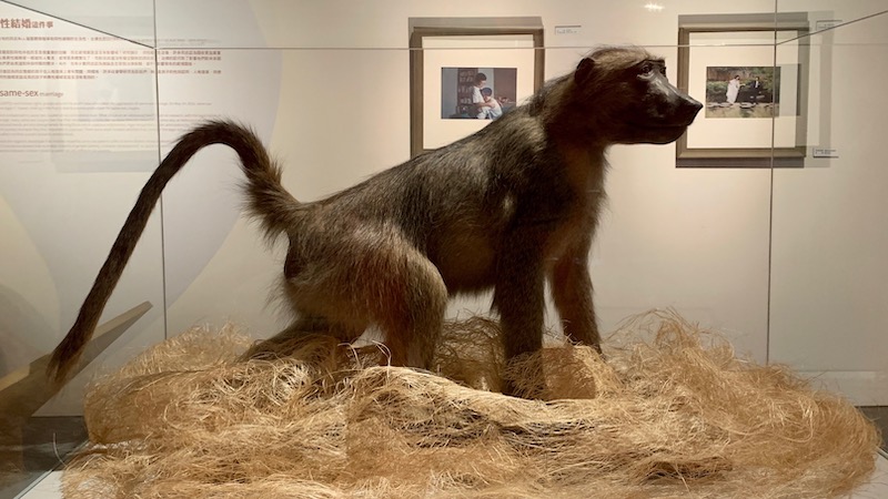 同性性行為看似與留下子嗣的目的背道而馳,卻具有多重意義。與人類基因相近的黑猩猩和狒狒,在演化過程產生利用性行為加強團隊聯繫、發展聯盟情誼並舒緩壓力的舉動。展場中,觀眾需要從狒狒標本「後方」閱讀展版,彷彿參與其建立親密關係的行為。展板論述「自然允許,文明禁止」引導著觀眾思考:我們能否以更多元的觀點看待同性議題?