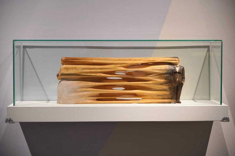 國立自然科學博物館「百年好合:當代婚姻之旅」特展中,林禹彤木雕作品〈面—5〉描繪婚姻關係的親密和隱含之法律義務。(劉德祥 攝影)