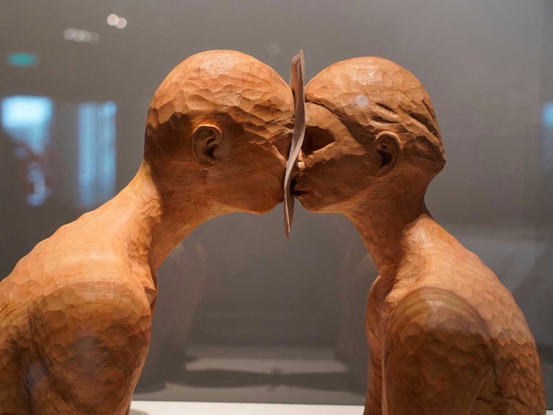 國立自然科學博物館「百年好合:當代婚姻之旅」特展中,林禹彤木雕作品〈面—5〉描繪婚姻關係的親密和隱含之法律義務。(劉德祥 攝影)
