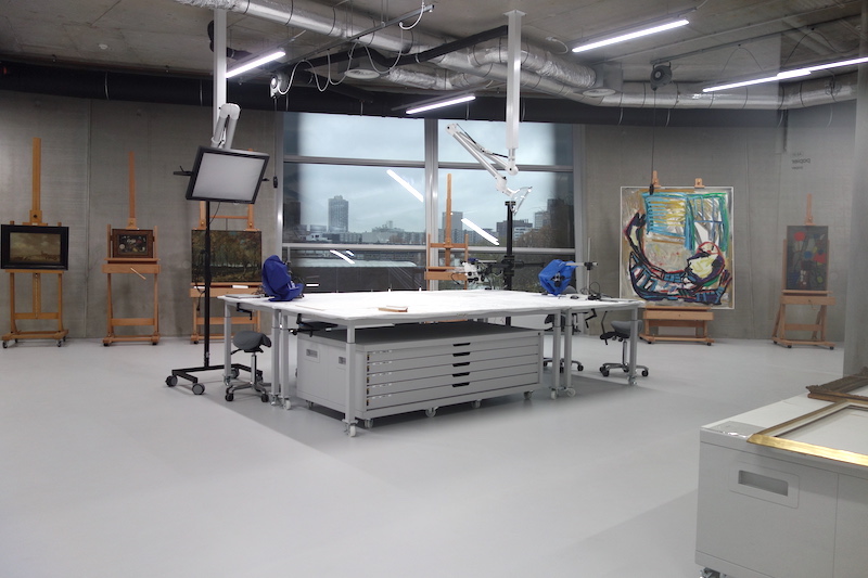 典藏庫的另一大看點,即是位於三樓、設有大片玻璃窗的4間修復工作室,包含紙質修復室、繪畫修復室、攝影與織品修復室,以及木質、金屬、玻璃與陶瓷修復室。觀眾可以隔著玻璃看見精良儀器與修復過程,也可在團體導覽時向導覽員提出疑問。由於美術館數量最多的館藏為紙質作品,故聘有全職的紙質修復師,其他媒材的修復師皆為專案合作。至於作品登錄、包裝與運輸,典藏庫只在一樓的出入口旁開放兩間作品包裝的工作室,供民眾觀看各式包裝材料與木箱。