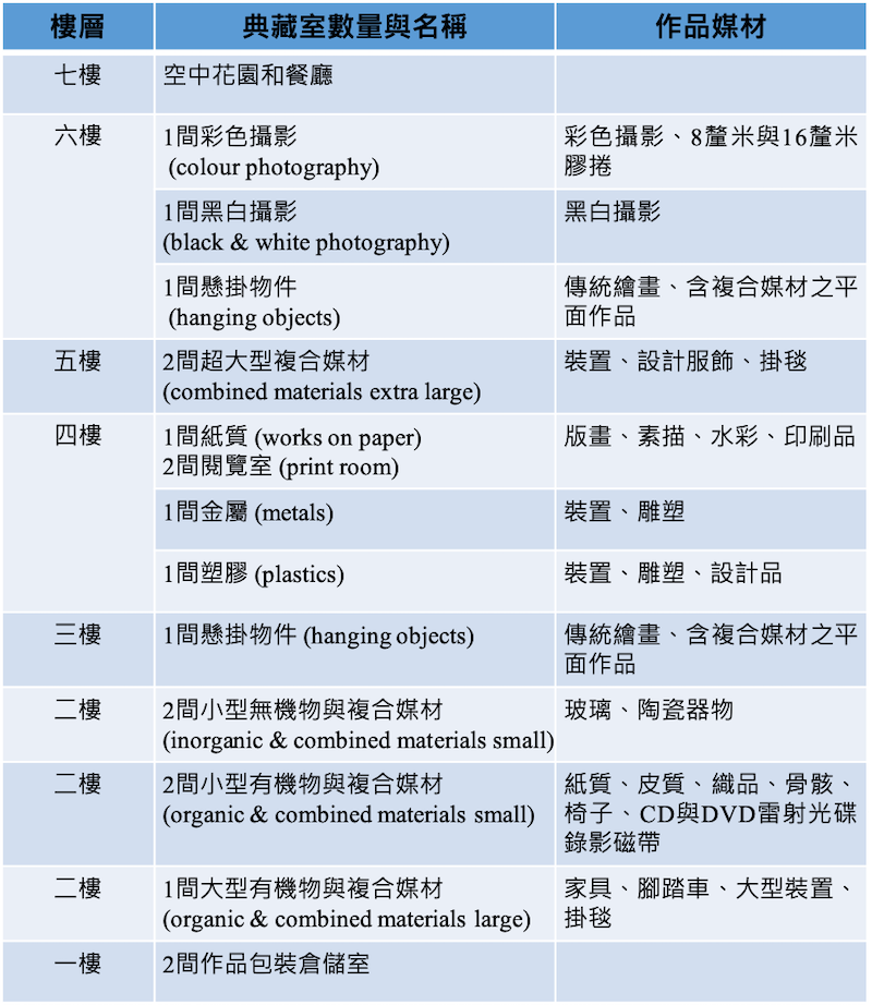 擁有七層樓空間的典藏庫,除了七樓的空中花園和餐廳,觀眾可在二到六樓之間找到14間館藏典藏室、5至6間私人收藏典藏室、4間修復工作室。數間作品包裝倉儲室則分散在一和二樓,以利作品運輸、靜置及隔離作業。向大眾公開之館藏依作品媒材與保存條件分類,也依現有空間設計做分配,以下為典藏室的樓層及分類介紹: