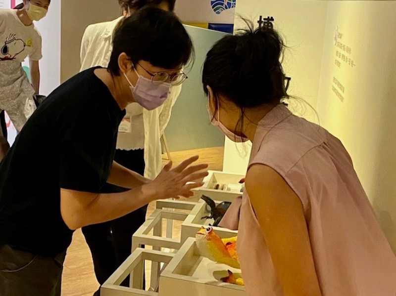 除了為兒童量身創作的藝術品,展間不乏以高美館園區自然元素為靈感的物件,例如特製的紙漿蜥蜴、園區內的石頭、馬陸標本等,除了降低製作成本,更能讓兒童透過感官接觸園區生態。