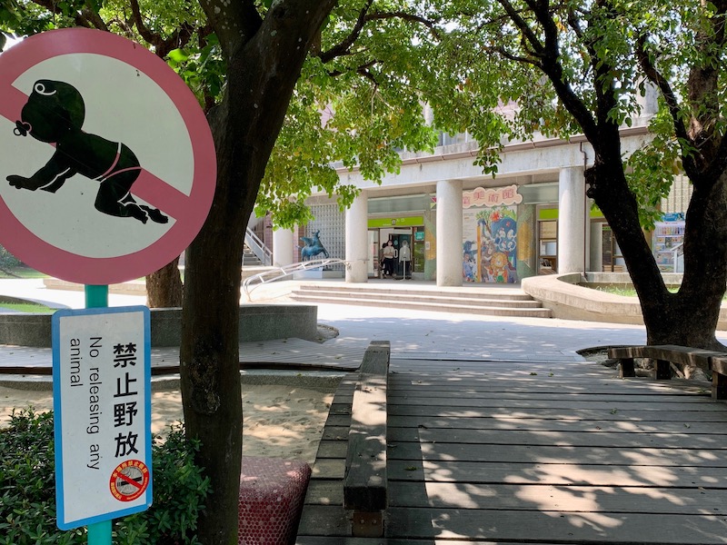 高雄兒童美術館入口設有「語重心長」的逗趣告示牌。(郭冠廷 攝影)