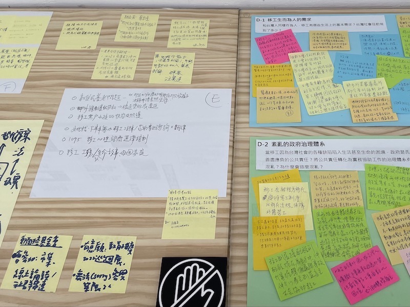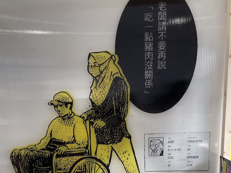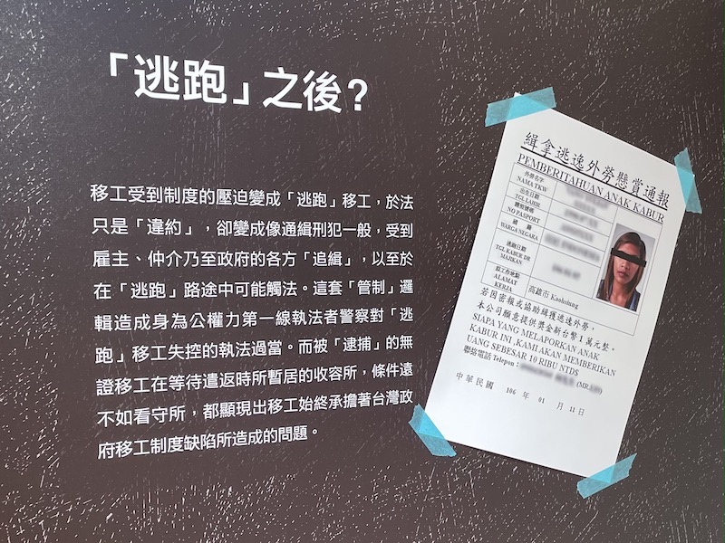 展覽中也讓七位移工現身說法,指出其所經歷的種種違反人權遭遇。例如,在疫情肆虐之時,被迫簽下禁足令而過著宛如犯人的生活。這些遭遇的結構性因素,呈現出政策的缺失,展覽也將複雜的政策制度轉譯為圖表,並以架構圖和互動式翻翻版,讓首次接觸相關法令與議題的觀眾,也能快速瞭解政策的矛盾與疏漏之處。