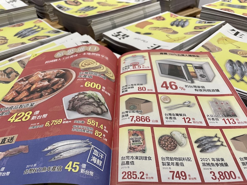 首先,展間以街訪影片、促銷型錄,以及琳瑯滿目的日常生活用品模型與標籤,標示我們所拿的手機、所吃的漁產、所穿的衣物等,內涵移工勞動的成果,同時也標示了相關產業移工引進的年份,為觀眾建立背景知識。用這種輕鬆、貼進日常的展示方式,使觀眾得以拉近與移工的關係,進而用嶄新目光瞭解移工的無所不在,及其對臺灣社會發展的貢獻與重要性。
