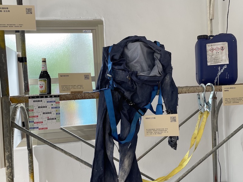 展場也透過場景復原,讓觀眾感受移工在漏洞百出的政策制度下,所陷入的危險日常。他們除了替代臺灣本地勞工維持人們衣食無缺的生活,也承擔著幕後生產線上的勞動風險。
