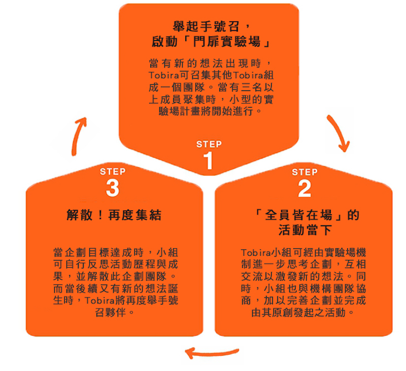 專業人士與Tobira如何順暢地進行平等對話呢?所有實驗場企劃皆為公開透明,每位Tobira都能在內部網站上共享資訊,機構團隊也能隨時暸解每項計畫進展,藉此讓專業人士支持Tobira,共同實現計畫目標。目標實現後,小組團隊將提供相關成員反思的結果,待新想法誕生則重新號召,再次啟動實驗場,成為具有動能的循環。