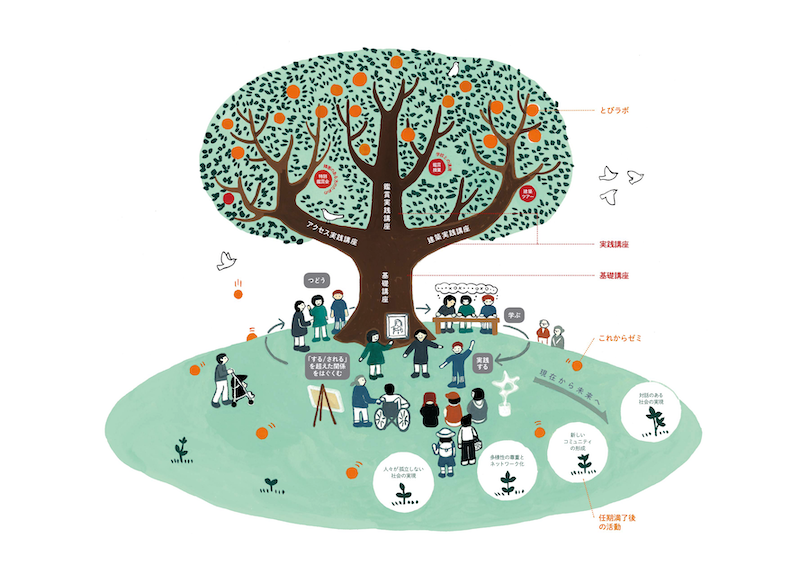 一顆大樹描繪著「門扉計畫」中的各項機制與組成活動。(©とびらプロジェクト2021)