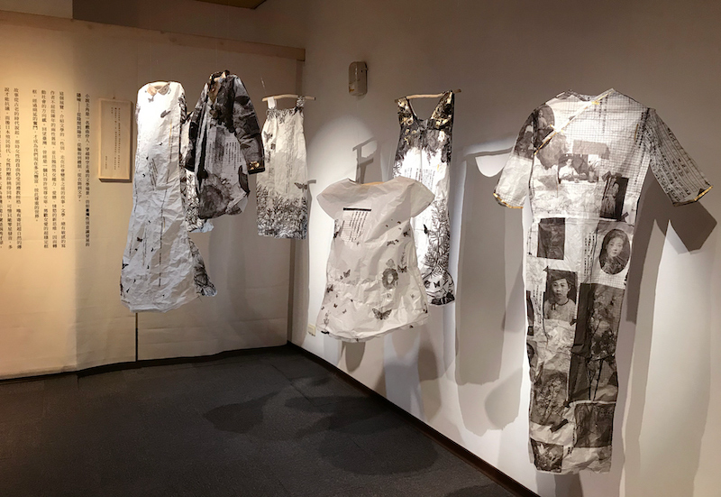 步入「可讀・性:臺灣性別文學變裝特展」展廳,首先映入眼簾的是數件灰白色調的衣裝,這些「衣服」由紙張拼縫而成,上頭分別印有文學摘句、歷史照片與植物花紋等內容,這是藝術家黃至正的作品《清明夢》。擁有這些衣裝的主人是誰?他們的性別是什麼?如何以衣服上的文字與圖像勾勒出他們的身形與輪廓?這也許就是「可讀・性」想傳達給觀眾的提問。