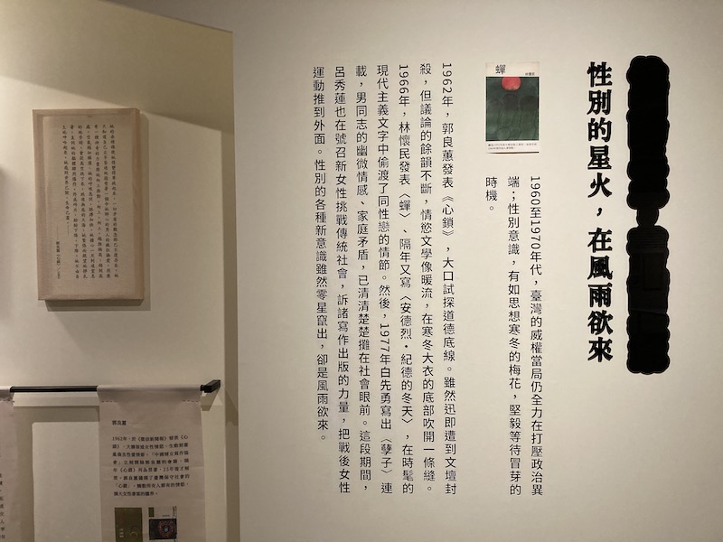 如何將龐雜的性別文學史,濃縮在一百坪的展覽空間?文學館提到,整合不同領域對於性別議題討論,並緊扣展覽核心關懷的內容,讓觀眾以易讀的方式親近文學作品。視覺設計上,策展團隊使用淺黃主色調,傳達身體與書寫合而為一的意象;展牆上印在絹布一幀幀的文學摘句,則襯托此展細膩的基調。