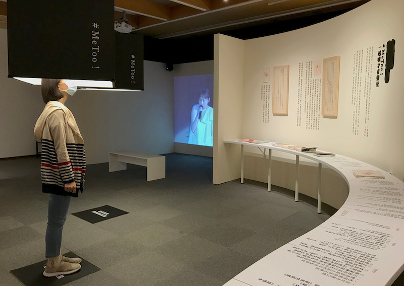 值得一提的是,在「#MeToo!一起喊才有聲量」的單元中,探討文學作品如何道出性騷擾、性侵害受害者內心的控訴,策展團隊設計了懸掛式的黑色四面方形罩,邀請觀眾走進去,並讀取林奕含《房思琪的初戀樂園》字句中的壓迫與痛楚,以理解受害者深陷黑洞的無助。
