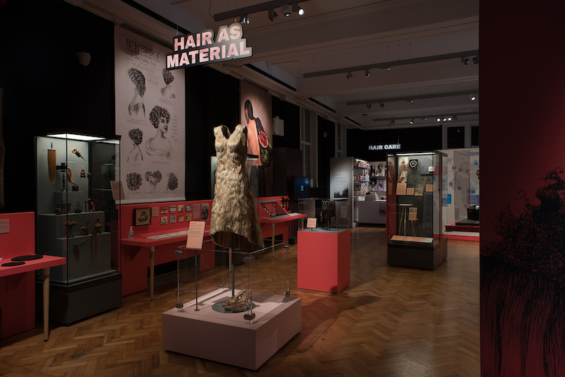 倫敦霍尼曼博物館在去年底推出特展「頭髮:不為人知的故事」,探索頭髮此纖維的多重面貌與文化意義。圖中中央作品為英國藝術家珍妮‧達頓(Jenni Dutton)創作的金髮洋裝,展現再利用媒材的創造力。(Courtesy: Horniman Museum and Gardens)