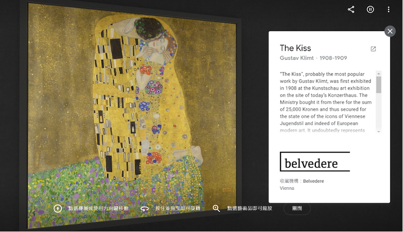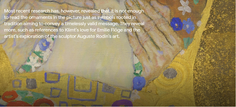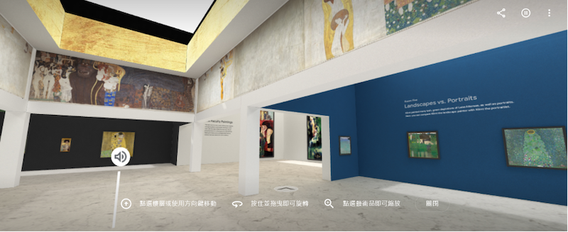 觀眾可藉由滑鼠與方向鍵,自由輕巧地在各個展間穿梭、端詳喜歡的作品。以「學院畫作」故事展廳為例,Google設計的互動式卷軸網頁瀏覽模式,讓觀者的視角得以精準地在一幅畫中隨著旁白挪移,觀賞畫中不同的角度與細節,進而了解克林姆的學院畫故事與歷史背景。