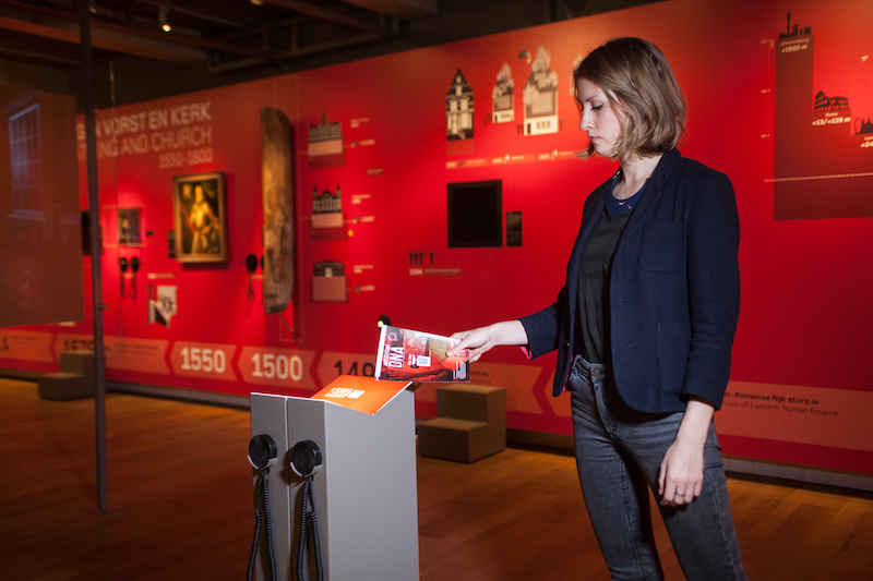 展示設計上,有別於一般城市博物館習慣透過大量文字敘述發展史,阿姆斯特丹博物館的展廳除了主標題外,幾乎沒有太多文字介紹,而是透過10部多國語言的導覽影片(英文、法文、德文、日文及中文等各國語言),介紹每一區的主題與重點文物。參觀觀眾可以依照母語,選取標示不同國旗的摺頁,並將摺頁於不同展區平台進行掃描,便可佩戴耳機觀賞導覽影片。