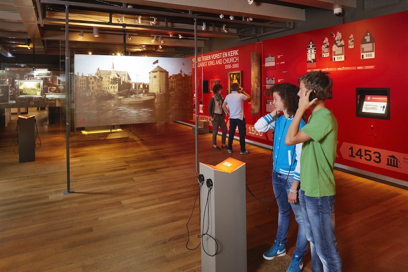 展示設計上,有別於一般城市博物館習慣透過大量文字敘述發展史,阿姆斯特丹博物館的展廳除了主標題外,幾乎沒有太多文字介紹,而是透過10部多國語言的導覽影片(英文、法文、德文、日文及中文等各國語言),介紹每一區的主題與重點文物。參觀觀眾可以依照母語,選取標示不同國旗的摺頁,並將摺頁於不同展區平台進行掃描,便可佩戴耳機觀賞導覽影片。